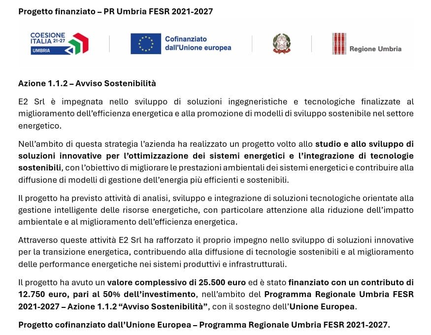 Di conseguenza, la E2 Srl ha deciso di intraprendere un progetto che ha lo scopo di sviluppare un sistema innovativo di integrazione intelligente ossia un sistema in grado di integrare la produzione di idrogeno con le fonti energetiche rinnovabili e la smart destination tramite logiche gestite da intelligenza artificiale, IoT e tracciate dalla block chain. Questo progetto consente di posizionarsi nella filiera, come integratore con un prodotto standardizzato e ad alto contenuto tecnologico ed innovativo.